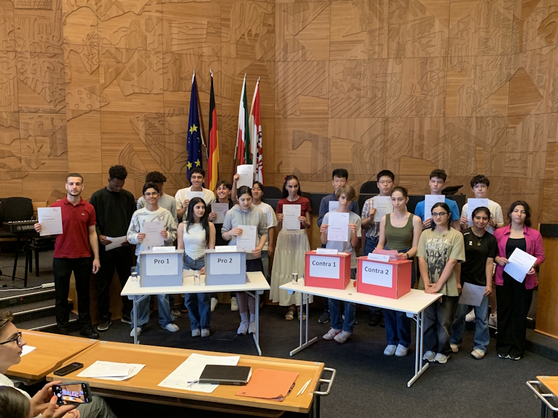 Am Freitag, dem 27.6.25, fand nun schon zum vierten Mal das Landesfinale im Rahmen des Programms „Debattieren in Sprachlerngruppen NRW“ statt. Erfreulicherweise konnte wieder der Plenarsaal des Düsseldorfer Rathauses einen würdigen Rahmen für die Debatten bieten. Bürgermeister Josef Hinkel begrüßte zum Auftakt alle Teilnehmenden herzlich im Rathaus. Im Anschluss wagten sich Schülerinnen und Schüler vom Erich-Broest-Berufskolleg in Essen, des Geschwister-Scholl-Gymnasiums in Pulheim, des Georg-Büchner-Gymnasiums in Köln Weiden sowie des Theodor-Fliedner-Gymnasiums in Düsseldorf an das Format der Debatte. In der Qualifikation ging es um die Frage „Soll die Nutzung von Mobiltelefonen an den Schulen verboten werden?“. Im Finale ging es dann um die Frage „Soll Schülerinnen und Schülern die Annahme von Nebenjobs verboten werden?“. Dabei gelang es den Sprachlernenden, Chancen und Probleme jeweils im Gespräch zu prüfen. Die Jury zeigte sich in ihrer Bewertung der Debatten dementsprechend beeindruckt von der Gesprächs- die Ausdrucksfähigkeit der Debattantinnen und Debattanten, zumal alle erst seit relativ kurzer Zeit in Deutschland leben und die deutsche Sprache erlernen. Der Sieger der Finaldebatte, Igor Korol vom Theodor-Fliedner-Gymnasium, wird nun im Oktober Nordrhein-Westfalen im Länderwettbewerb vertreten. Wir wünschen ihm viel Erfolg.